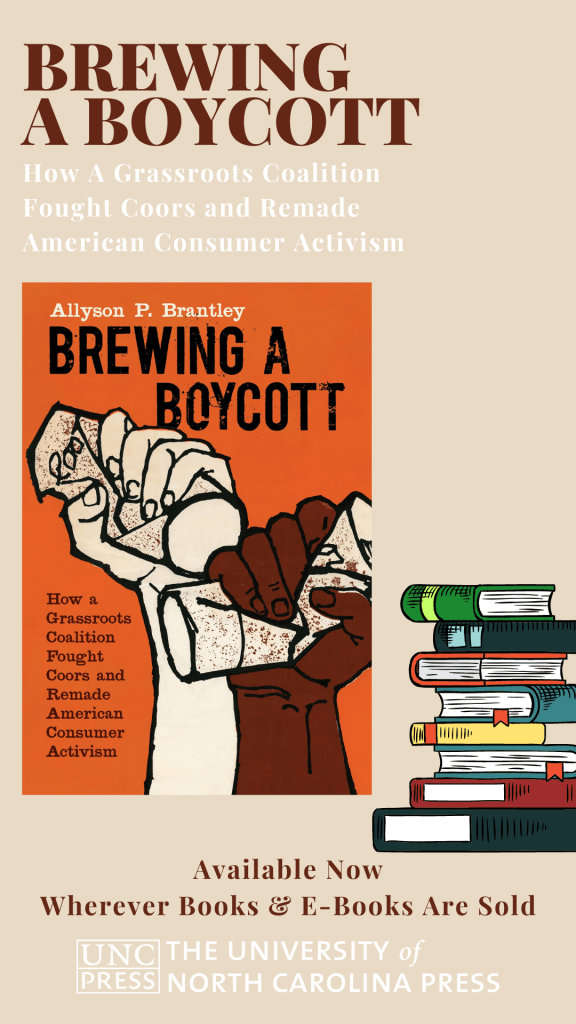 Press, talks, and other information about Brewing a Boycott: How a Grassroots Coalition Fought Coors & Remade American Consumer Activism (University of North Carolina Press, 2021).